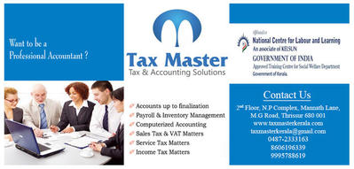 Sales tax practitioner course in Thrissur, Kerala - TAX MASTER - 0487-2333163 Contact details : 2nd Floor, N.P. Tower, Mannath Lane, M.G. Road, Thrissur. Tel : 0487-2333163, 8943912300, 9995788619. E-mail : taxmasterkerala@gmail.com Website : www.taxmasterkerala.com TAX MASTER is an accounting firm established in Thrissur, Kerala with a team of tax consultants, company secretaries and financial advisors offering Accounting and Taxation Services to Traders, Manufactures, Distributors, Dealers and various types of Service Providers. We have support from resource persons in the relevant areas and offer the best services to our clients. We are also an Accounting and Taxation Training firm. We are affiliated to the National Centre for Labour and Learning (NACELL) an associate of KELSON, Resource NGO to Govt. of India for imparting training. After our training, candidates are examined and certified by NACELL. NACELL certificates have got high value and credibility among various employers in India and abroad. Candidates seeking employment abroad can get certificates issued by NACELL attested by Embassies of various countries. OUR COURSE You need practical training in accounts? Only computerized accounting & theory studies are not sufficient, it will be realized when you attend an interview. You should be thorough in handling various kinds of accounts up to finalization. Within a short period you can learn a reputed work. TAX MASTER in Thrissur, Kerala offers you Diploma in Practical Accounting and Sales Tax Practice. We are accounting & Tax contractors not an institute. > Affiliated by National Centre for Labour and Learning (NACELL), Govt.of India. > Course for undergraduate, graduate and post graduate students. > Training is not Batch Wise. > Sales tax practitioner License for B.Com qualified Candidates. > 100% placement assistance. > Special help for non-Commerce students. Quality Training focus on: 1. Accounts - Manual & Computerised upto finalization. 2. Payroll Management(ESI & PF). 3. Inventory Management. 4. Sales Tax - Registration, E- Filing etc. 5. Service Tax - Registration, Payment, Filing etc. 6. Income Tax - Tan & Pan Registration, TDS deduction, Payment, Filing return etc. For more details, Visit our Website www.taxmasterkerala.com ELIGIBILITY : Any qualification & age (If interested in accounts). DURATION : 1st option: 3 hrs per day - 6 months 2nd option: 6 hrs per day - 3 months TRAINING HOURS : You can select your own convenient time between 7:00 am & 7:00 pm. Regular class except Sunday. Contact details : 2nd Floor, N.P. Tower, Mannath Lane, M.G. Road, Thrissur. Tel : 0487-2333163, 8943912300, 9995788619.